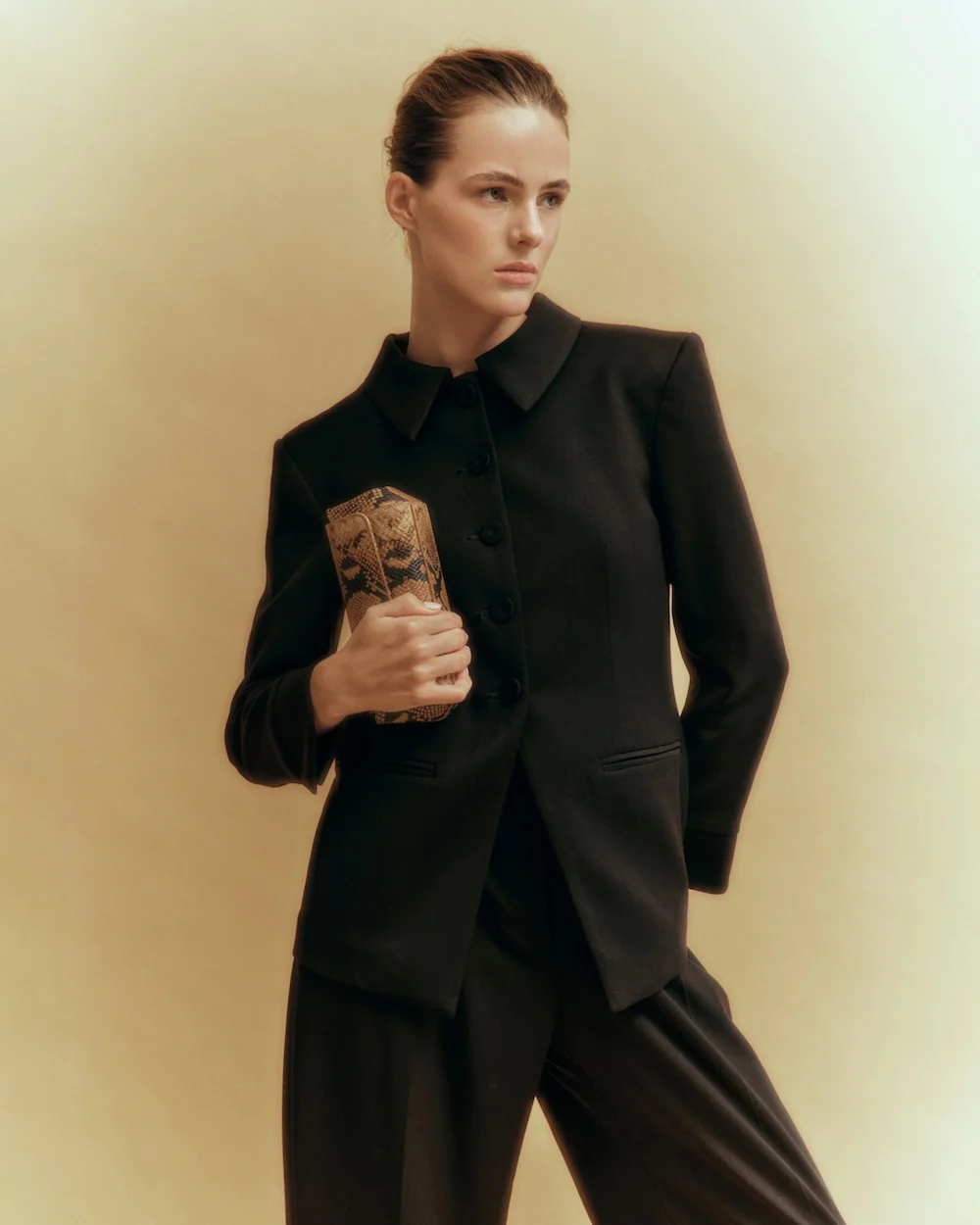 - Botonadura frontal, con cinco botones forrados en el mismo tejido hasta la cintura, desde donde se abre la chaqueta creando un ligero efecto peplum.