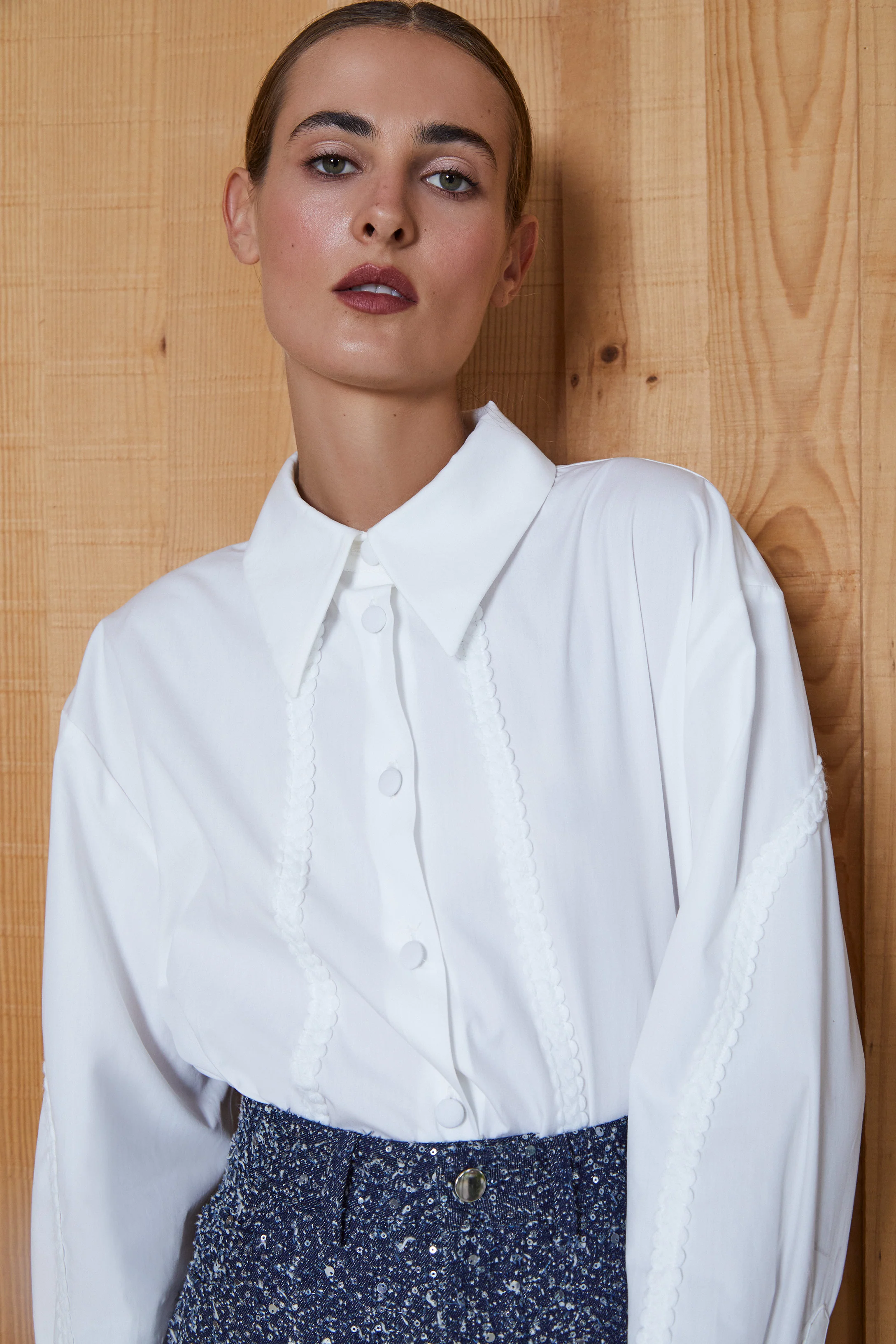 El modelo SIENA se trata de una camisa oversized, de palas de cuello marcadas, botonadura frontal vista con botones forrados, manga larga y puño para gemelos.