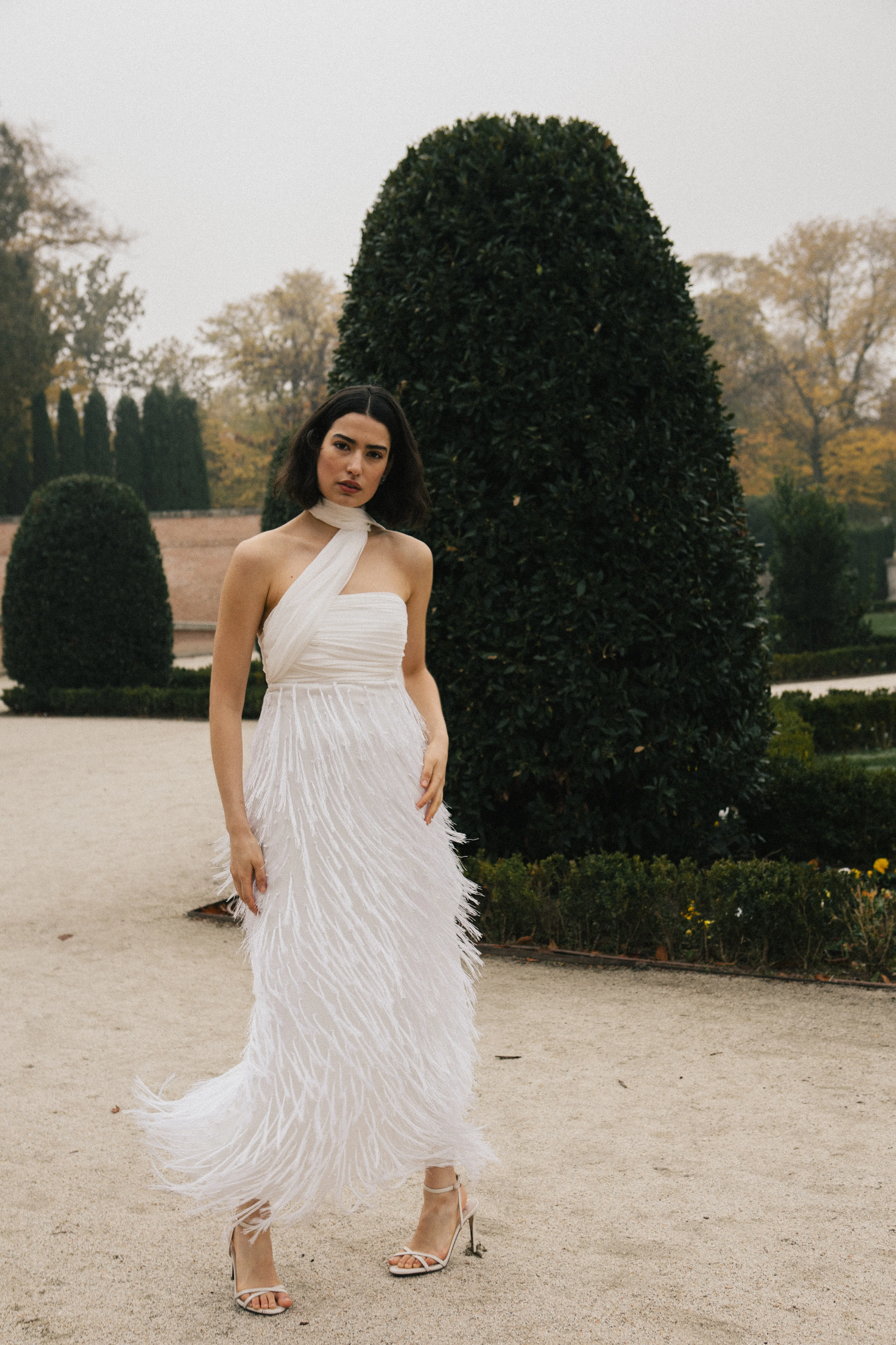 El modelo GRETA es un vestido palabra de honor confeccionado en gasa de viscosa y flecos bordados. El cuerpo está drapeado y cuenta con un tirante alrededor del cuello que finaliza en caída. El detalle más característico de este diseño es el gran movimiento que aportan los flecos.