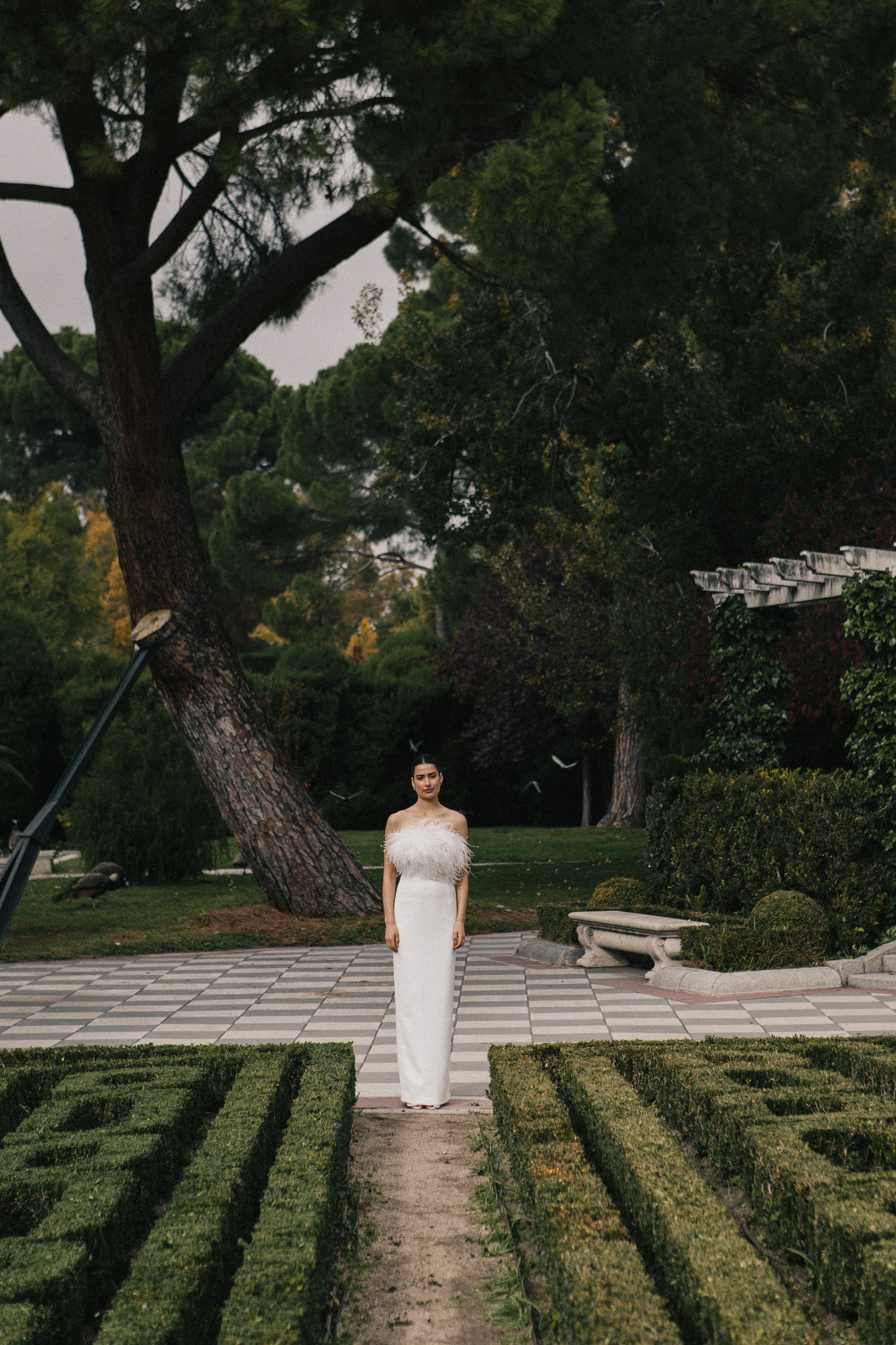 El modelo ISABEL WHITE está confeccionado en crepe color blanco, un tejido con gran caída y movimiento que cuenta con un tratamiento para evitar que las arrugas se marquen en exceso. Se trata de un diseño de corte largo palabra de honor con plumas de avestruz en la parte superior delantera.