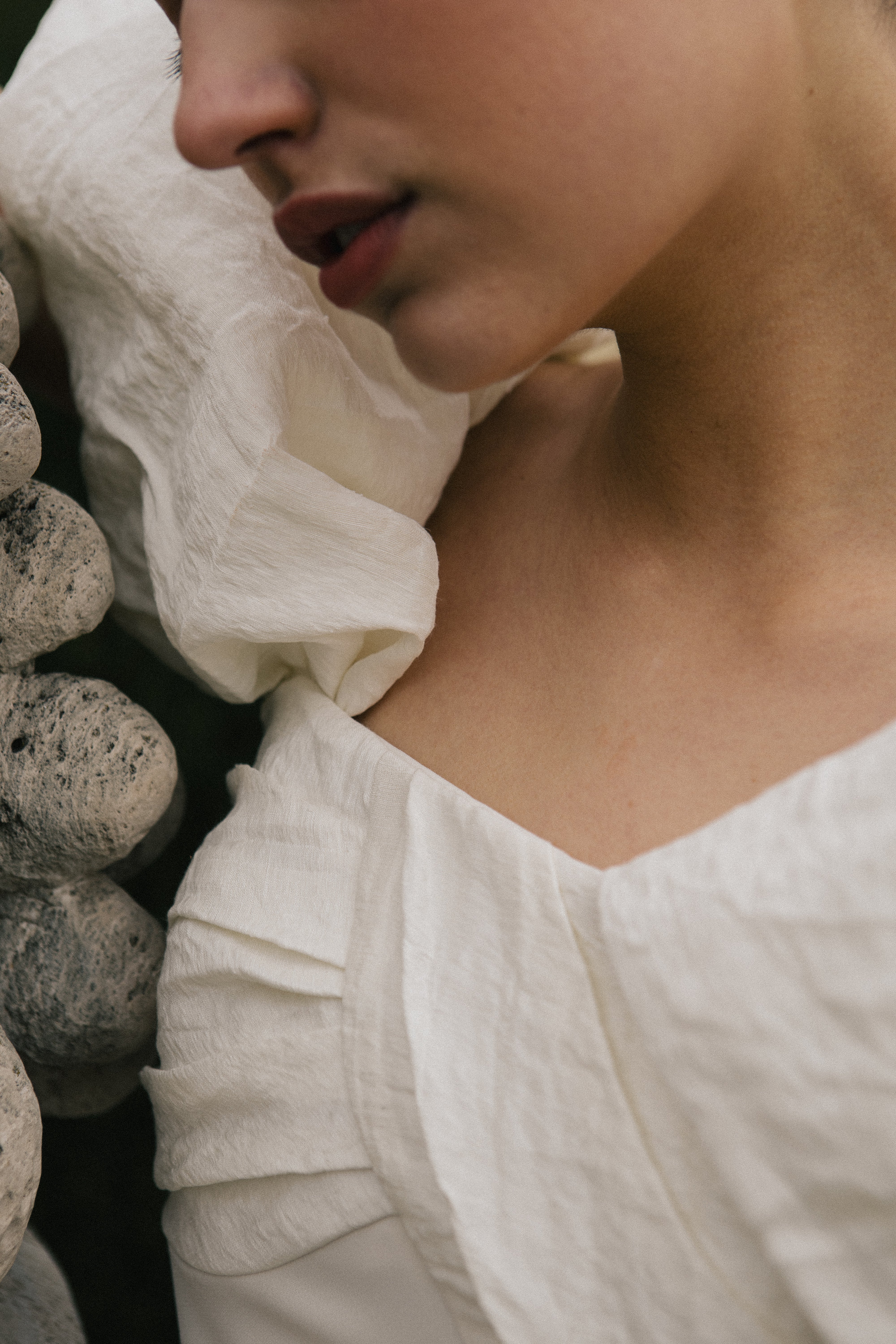 El modelo JANA es un vestido de corte recto y está confeccionado en dos tejidos, la parte de superior en tejido rústico de lino en color blanco hueso, y el cuerpo en un crepe de seda al tono. Lo característico de este diseño es el drapeado en el pecho que finaliza con una manga caída en uno de los brazos y un gran volumen asimétrico en el hombro.
