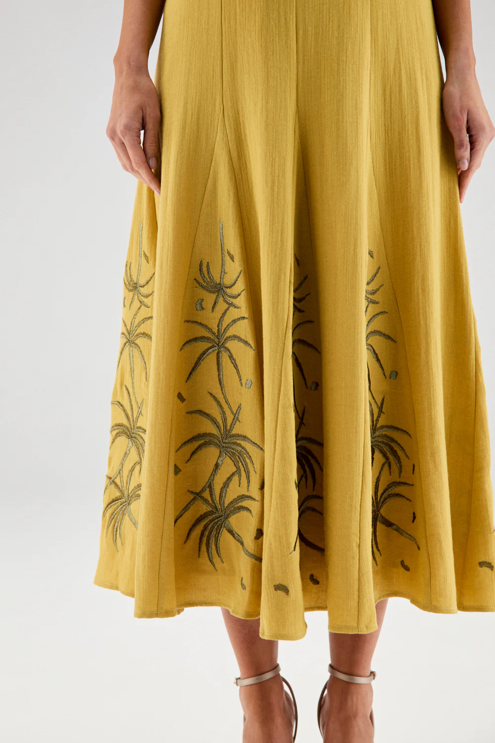 Cada uno de estos godets tiene un bordado en hilo metalizado con motivos de palmeras en dos tonos, que aportar brillo y son un precioso detalle que hacen de Ondina un diseño Ășnico.Â