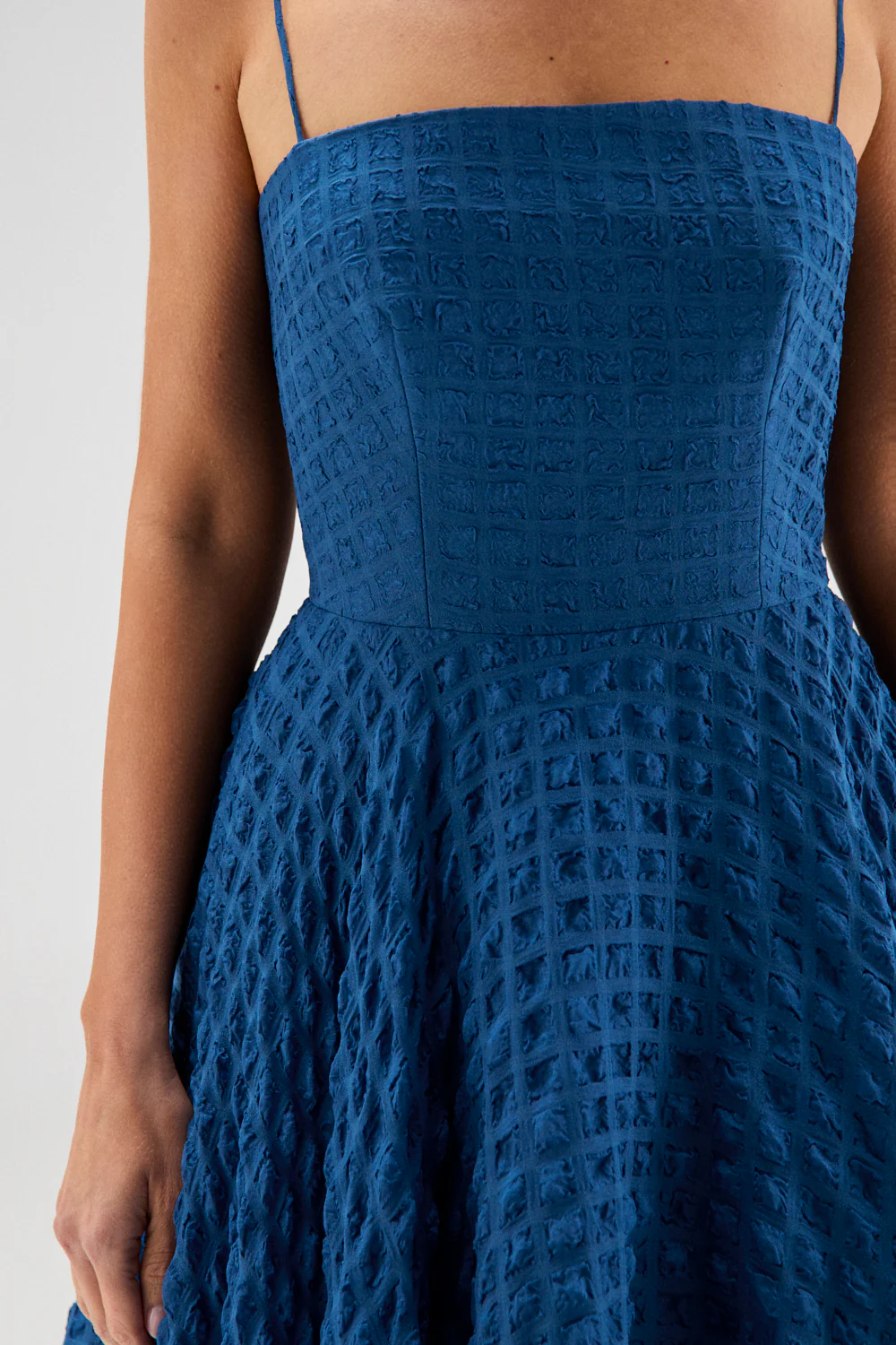 El modelo PILAR FUCSIA es una vestido de escote recto con tirantes finos y corte midi hasta el tobillo. Está confeccionado en organza gofrada color azul, un tejido estructurado y ligeramente rígido.